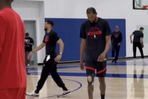 火箭队记:杜兰特在训练中看起来状态不错 没有明显的跛行或不适